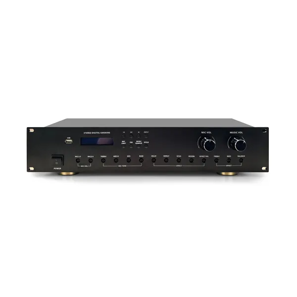 This integrated amplifier combines powerful audio amplification with a built-in digital effects processor, delivering clear, dynamic, and highly controllable sound performance. With multiple audio input options including Bluetooth, USB, optical, coaxial, and HDMI (ARC), it offers excellent compatibility for a wide range of audio sources. Designed to meet both music playback and vocal reinforcement needs, the amplifier features professional-grade microphone inputs with phantom power support, advanced tone control, anti-feedback suppression, and adjustable echo and reverb effects. An intuitive LCD display ensures easy operation, making this amplifier an ideal solution for conference rooms, classrooms, karaoke venues, and commercial audio applications where sound quality and flexibility are essential.