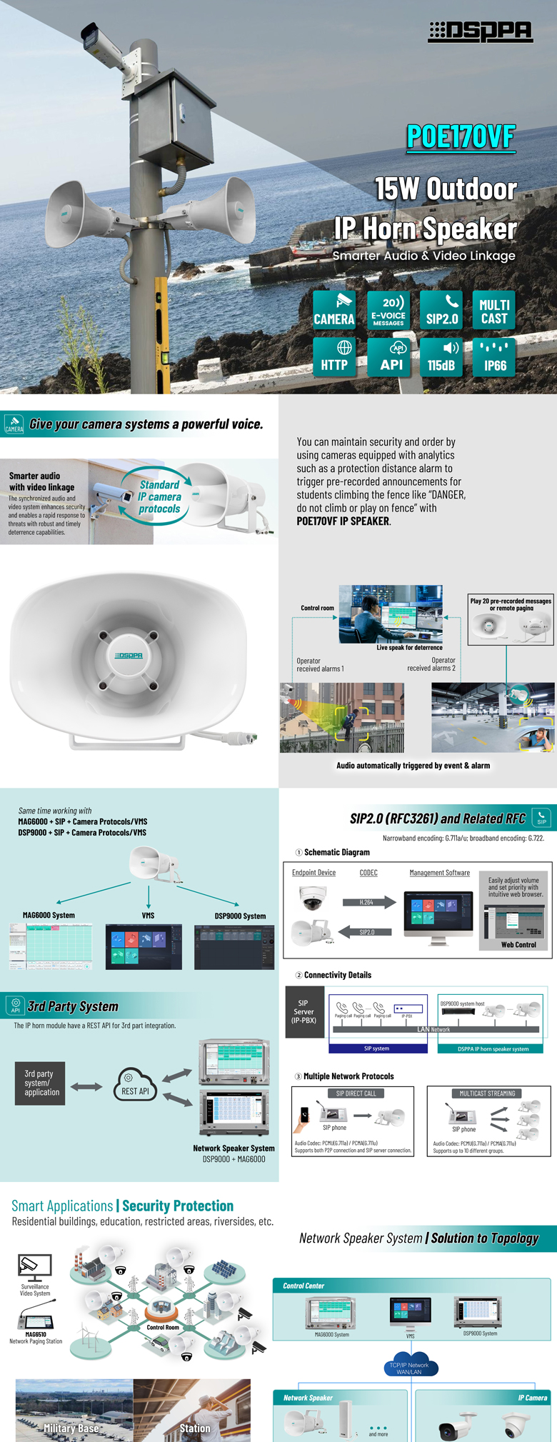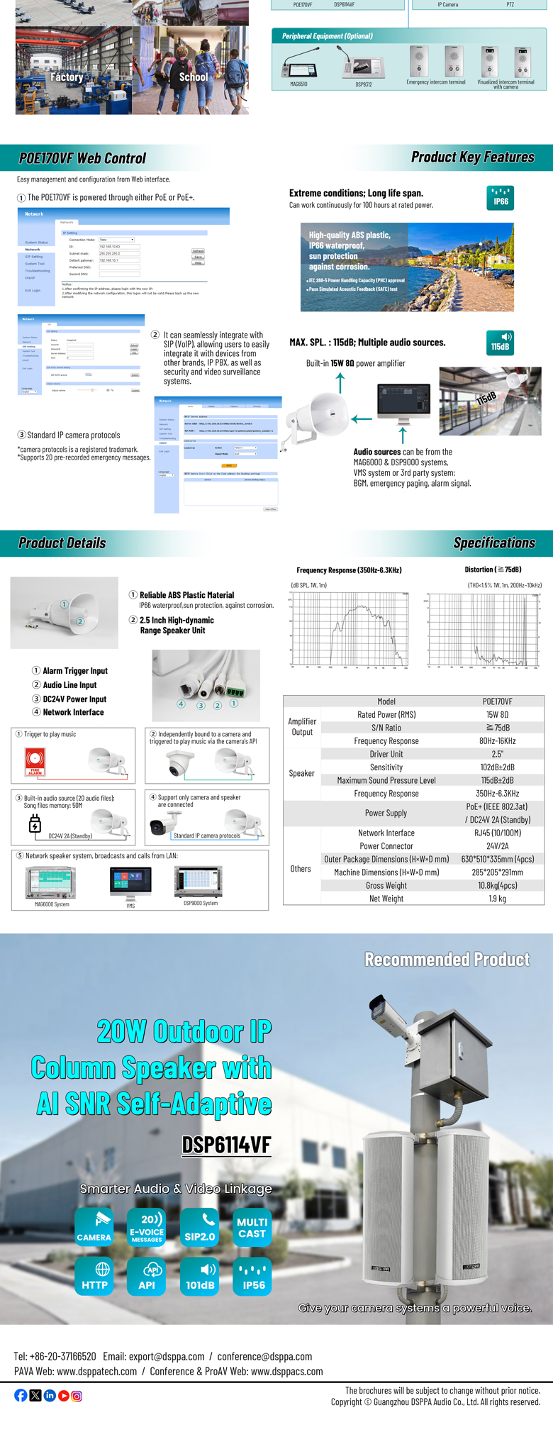 DSP6114VF Outdoor AI SNR Self-adaptive POE Column SpeakerAugust 8, 2025The Outdoor AI SNR Self-adaptive POE Column Speaker system features high-sensitivity, wide dynamic range drivers for powerful bass output. Integrated with third-party SIP servers, it seamlessly connec...viewwe will contact you within 24 hours.
