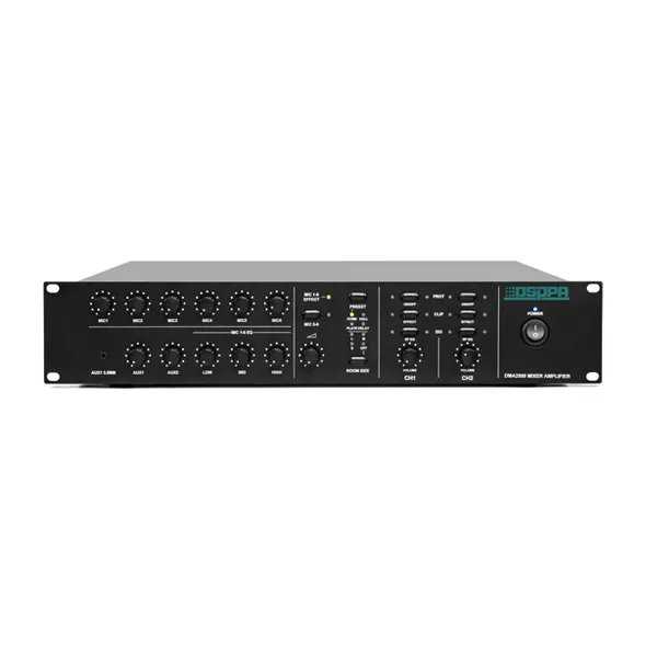 MA2250U 2*250W Multimedia Mosque AmplifierJuly 7, 2022MA2250U is a 2-Channel multimedia mosque mixer amplifier with RMS power 2*250W.Separate 2 channels output control of Echo/Bass/Treble/ Volume and built-in 3 Mic and 1 AUX and USB/Bluetooth.It is suita...viewwe will contact you within 24 hours.