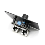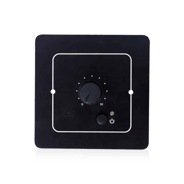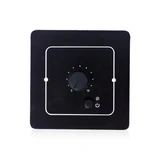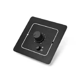 The Wall Panel with Volume Control connects via an RJ45 port and supports the networking of multiple panels in a daisy-chain configuration. It is designed for remotely powering the main unit on/off and precisely selecting or switching specific audio channels, enabling centralized management across different areas.
